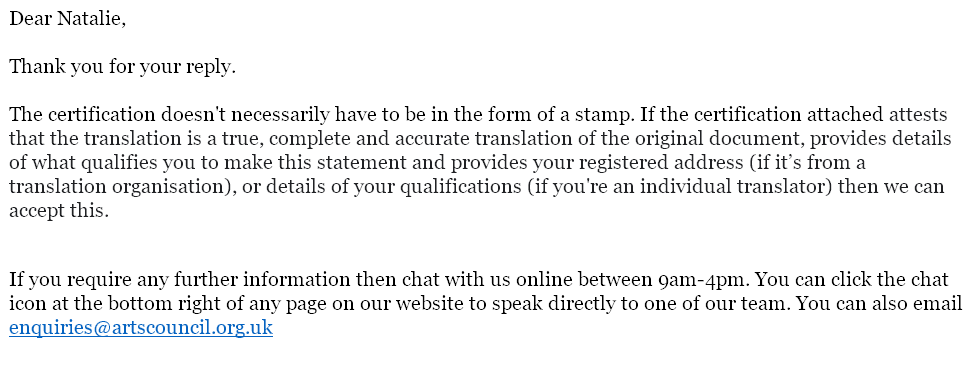 But does that mean that anyone can translate your visa evidence? To double-check, I reached out to the Arts Council to find out what they are looking for when they receive translated evidence.