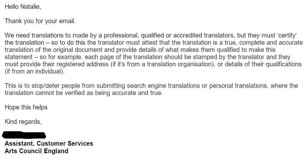 But does that mean that anyone can translate your visa evidence? To double-check, I reached out to the Arts Council to find out what they are looking for when they receive translated evidence.